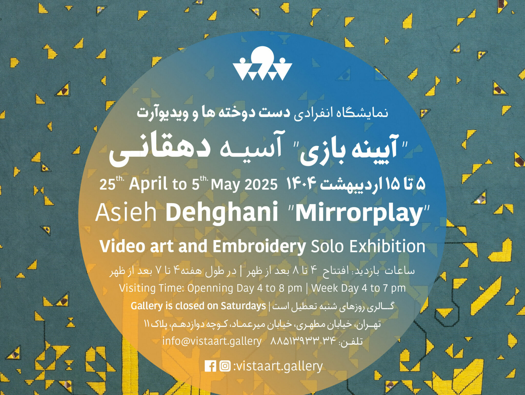 Vista art gallery District 7، No. 11, 12th Alley, Iran, Tehran, Select a State:, Iran, Islamic Republic ofگالری ویستا این روزها نمایشگاه دستدوخته ها و ویدئوآرت "آیینه بازی" را میزبانی میکند که مجموعه آثاری از آسیه دهقانی است. این نمایشگاه جمعه 5…
